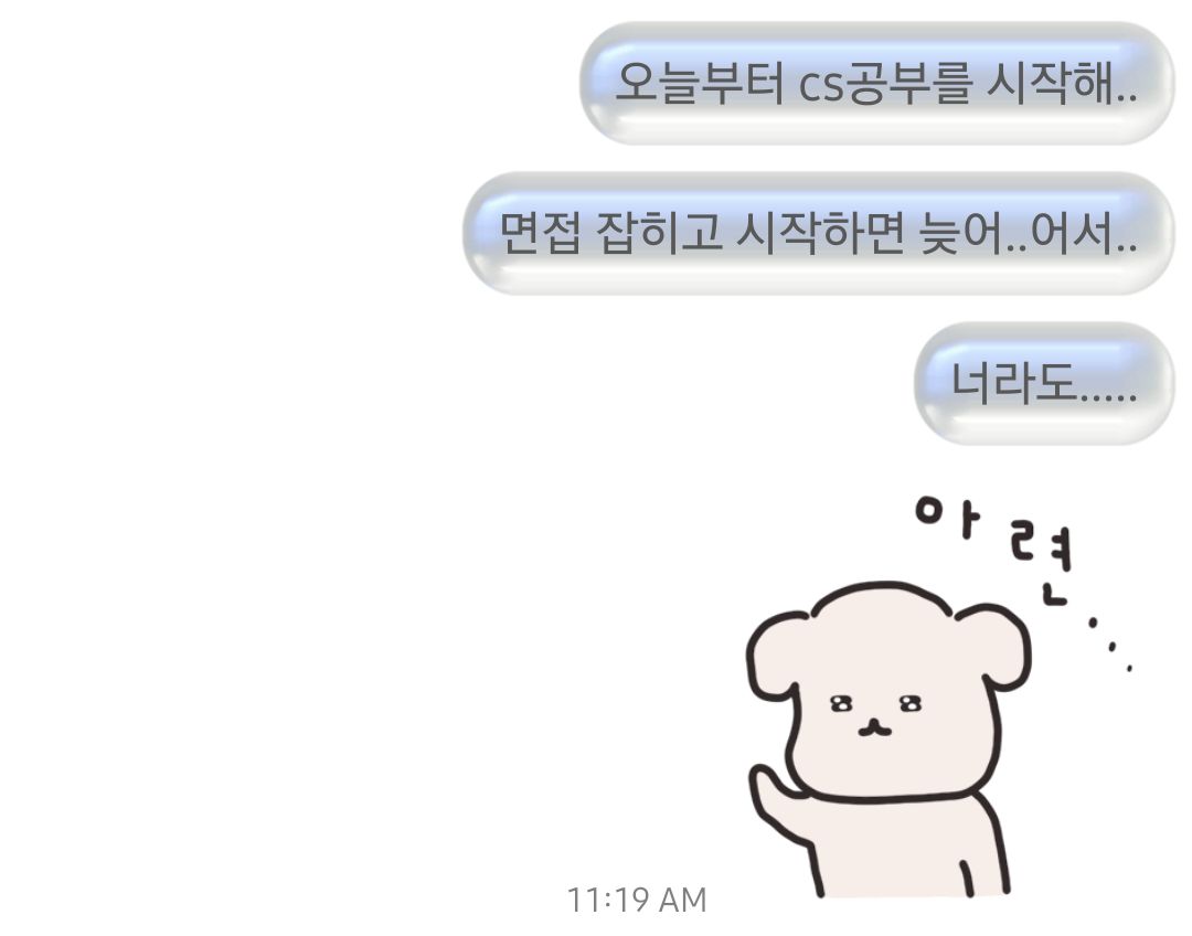 기술 답변 외우다가 같이 취업준비중인 친구들한테 절실한 마음을 담아 카톡을 보냈다.. 기술 면접 대비 미리미리 하라고...! 전날에 급하게 외워선 안된다고 너무너무너무 느껴버려서 여기저기 준비해 두라고 간청하고 다녔다.